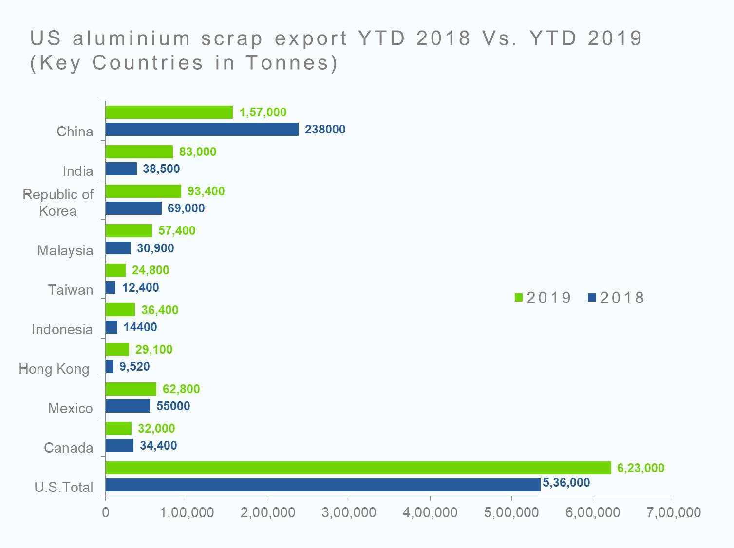 Aluminium Scrap Exports to other South Asian countries like Hong Kong, Indonesia, Taiwan, Malaysia, and South Korea have increased exponentially Year-over-year during the first four months of 2019.