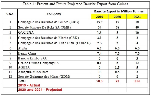There is no processing or beneficiation required for Guinea bauxite as they have natural low silica and except CBG other companies export bauxite without any drying. According to the plan of various active companies of Guinea, the bauxite production and export from Guinea is likely to increase significantly in the coming years. A simple projection of bauxite production and export by leading mining companies is provided in Table-4.