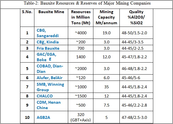 There are at present 10 active bauxite mining companies in Guinea, the oldest among them is CBG and the largest producer is SMB-Winning Group. From a resource point of view, the CBG concession area is endowed with more than 4 billion tons of bauxite and this is the highest among all the operating bauxite mines. Bauxite is mined by open cast mining method by drilling blasting as well by the surface miner. More and more Guinea bauxite is now being exploited by a surface miner as this is found an efficient and environment-friendly technique and does not require ore crushing.  The present bauxite resources and mining capacity of major mining companies are quite healthy as one can see in the Table-2.