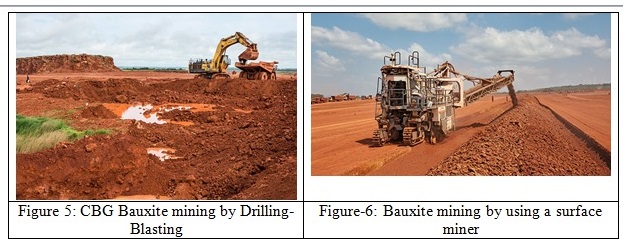In the opencast mines of CBG, Bauxite is exploited by simple drilling-blasting technique and loaded into the trucks as shown in Figure-5. Bauxite is crushed, blended and partly dried at Kamsar port before export. RUSAL at their Kindia operation uses Surface Miner (Figure-6) to directly produce <100mm bauxite, which is exported from Conakry port without drying. SMB, a Chinese company, mines bauxite by drilling-blasting and exports medium grade (44%-45% Alumina) bauxite from the jetty on river Nunez. Now SMB is also using surface miner along with traditional drilling blasting.