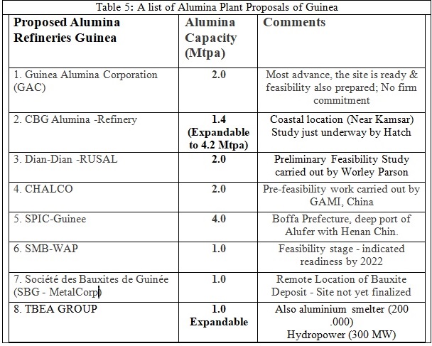 • This is an appropriate time for Guinea to set up alumina plant and export value-added product in place of raw bauxite. About 8 bauxite mining companies have put forward their plans, however, alumina projects are yet to be materialized.