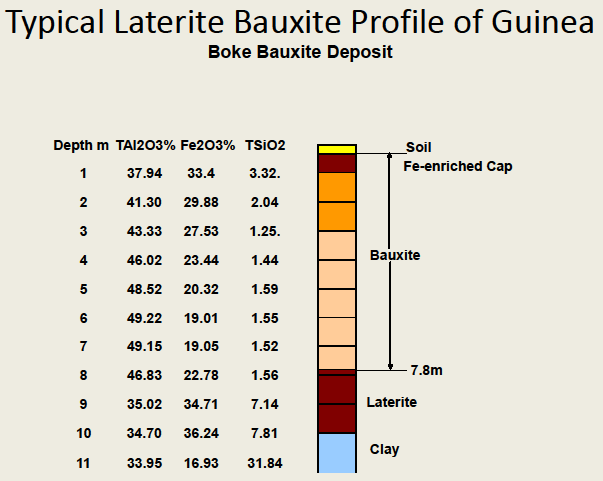 2. Bauxite Geology and Ore Characteristics   The lateritic bauxite deposits of Guinea occur at low levels (200 to 400 m above MSL) in the flat-topped plateaus with practically negligible soil and overburden. The bauxite is underlain by a stacked pile of argillite, siltstones and minor sandstone intercalations of the Lower and Upper Members of the Faro Suite, widely intruded by sills and dykes of Mesozoic dolerites. A typical laterite bauxite profile of Guinea is shown here (Figure-1).