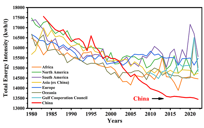 Since the 1980s, the aluminium industry in China has made significant progress in two aspects. One is the annual output of primary aluminium, which has continuously risen from roughly 400,000 tons in 1983 to 40.21 million tons in 2022, accounting for 58.8% of the total annual global output. Another aspect is the average total energy intensity (i.e. the average comprehensive AC power per tonne of aluminium), which has consistently decreased from 17,560 kWh/t-Al in 1983 to 13448kWh/t-Al in 2022, a reduction of 4112kWh/t-Al over the past 40 years. Meanwhile, China has continuously been the world’s best indicator of energy consumption for aluminium electrolysis in the last decade. The above trends can be clearly seen from the data of global primary aluminium output (Fig. 1) and total energy intensity (Fig. 2) (Note: data sourced from the International Aluminium Institute (IAI), and Chinese data before 1998 sourced from China Nonferrous Metals Industry Association).