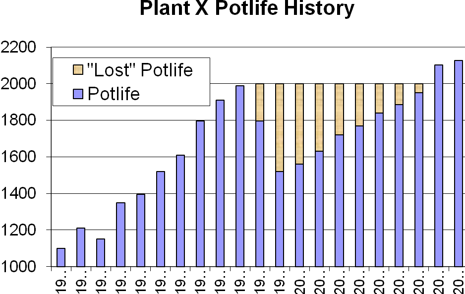 A real example provides an illustration. Figure 2 shows a steep drop in potlife from 1997 to 1999 caused by a “mistake”. The specific causes and lessons learned from this example will be discussed in another article. The significant point here is that, even though the problem was recognized and corrected quickly, it took nine years for cell life to recover to the previous level.  The cost of the lost service life was more than $18 million.