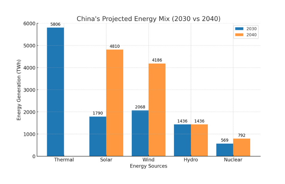 China’s energy mix will evolve to meet growing demand, with thermal power projected to reach 5,806 TWh by 2030. Renewable energy will increase significantly, with solar expected to surpass wind by 2034, reaching 1,790 TWh by 2030 and 4,810 TWh by 2040. Wind power will hit 2,068 TWh by 2030 and 4,186 TWh by 2040, while hydropower will stabilise around 1,436 TWh. Nuclear power will expand to 569 TWh by 2030 and 792 TWh by 2040, supporting energy security and reducing fossil fuel use.