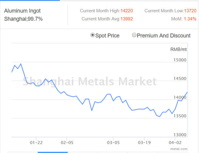 According to another update from SMM, average A00 aluminium ingot has seen a further rise to RMB14200 per tonne on April 10 218, as opposed to 14080 yesterday. The prices are expected to range between RMB 14180 and RMB 14220 per tonne with spot discounts to settle at RMB 100 to RMB 60 per tonne.