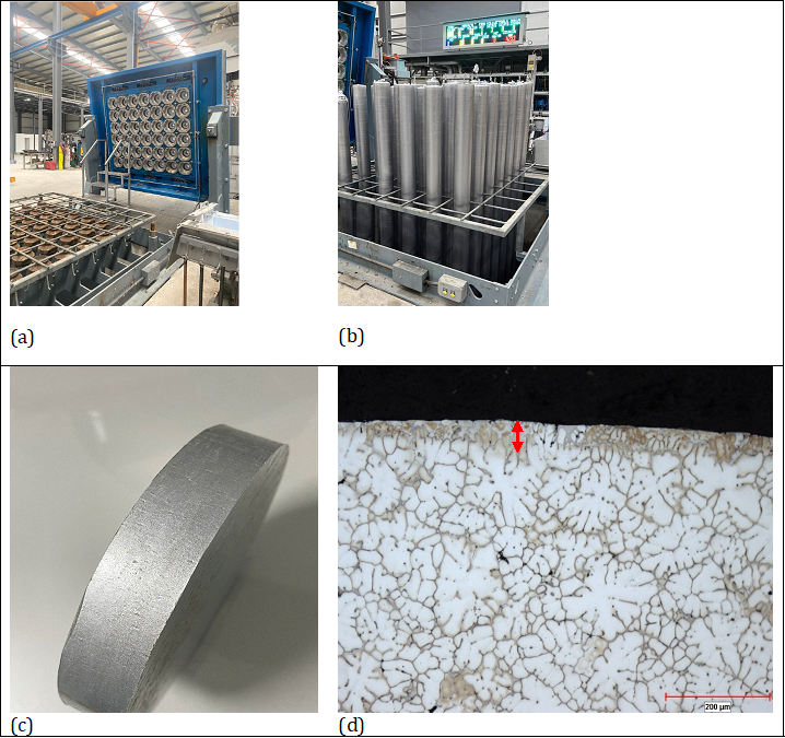 Figure 1. 7XXX series casting, (a) casting table, (b) billets on the casting pit, (c) slice of the billet and (d) Shell zone of the billet.