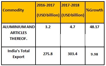 The value of total aluminium and aluminium products export stood at 4.7 billion compared to 3.2 billion in 2016-17.