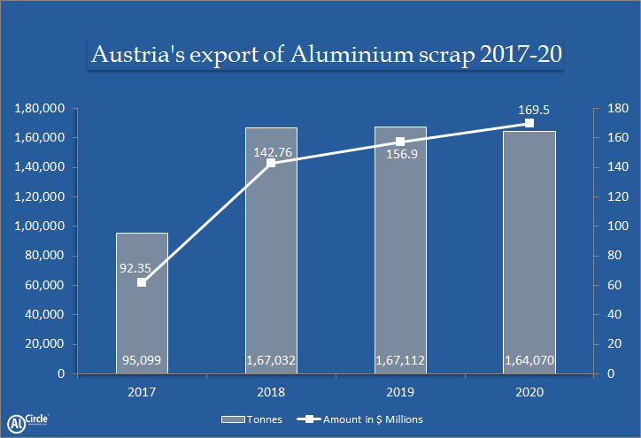 Austria’s aluminium scrap export in 2017 has been recorded at 95,099 tonnes and the earning stood at $61.83 million, whereas the scrap export in 2018 saw growth by 75.64%, as export volume remained at 167,032 tonnes and the earnings rose to $142.76 million.