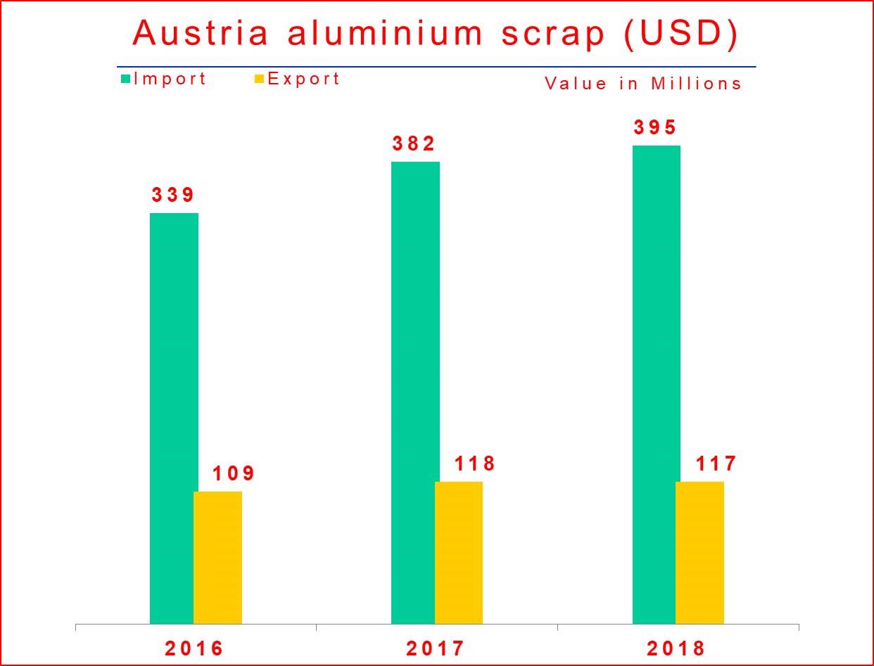Austria is estimated to import 304157 tonnes of aluminium scrap in 2018, up 9788 tonnes from last year. The value of import is estimated to be about US$ 395 million.