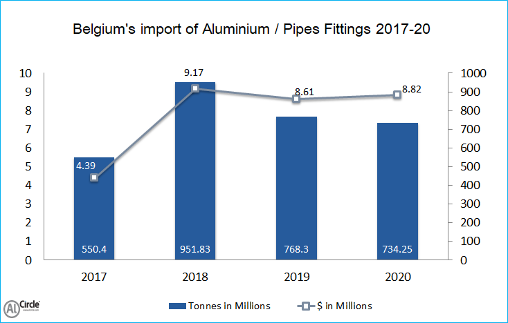 Belgium’s import of aluminium pipes/tubes fittings in 2017 remained at 550.40 million and expenditures stood at $4.39 million, while in 2018 the import picked up to 951.83 tonnes, reflecting a growth of 72.93% and expenditures also climbed to $9.17 million.