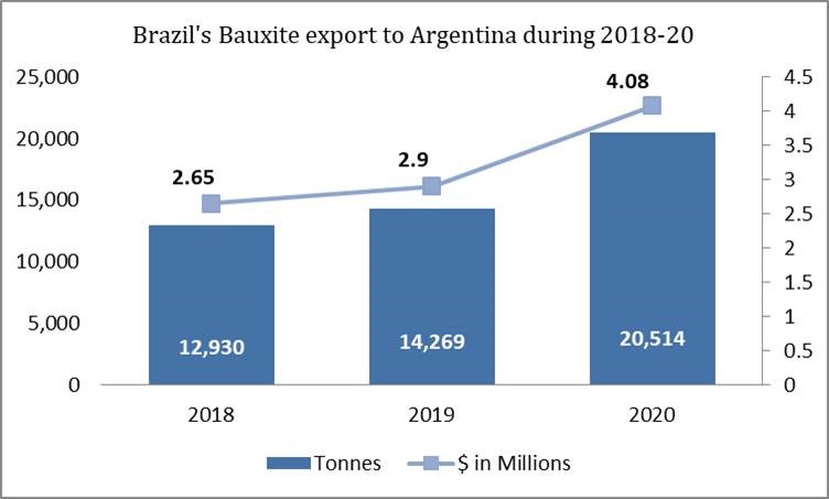 Brazil’s export of bauxite to its neighbouring country Argentina during 2018-19 has been recorded at 27,199 tonnes and revenue earnings stood at $5.55 million. The export for 2020 has been expected to be at 20,514 tonnes and earnings to stand at $4.08 million; however, when the export volume and earnings of the previous two years get assorted, it signifies 47,713 tonnes and $9.63 million respectively.