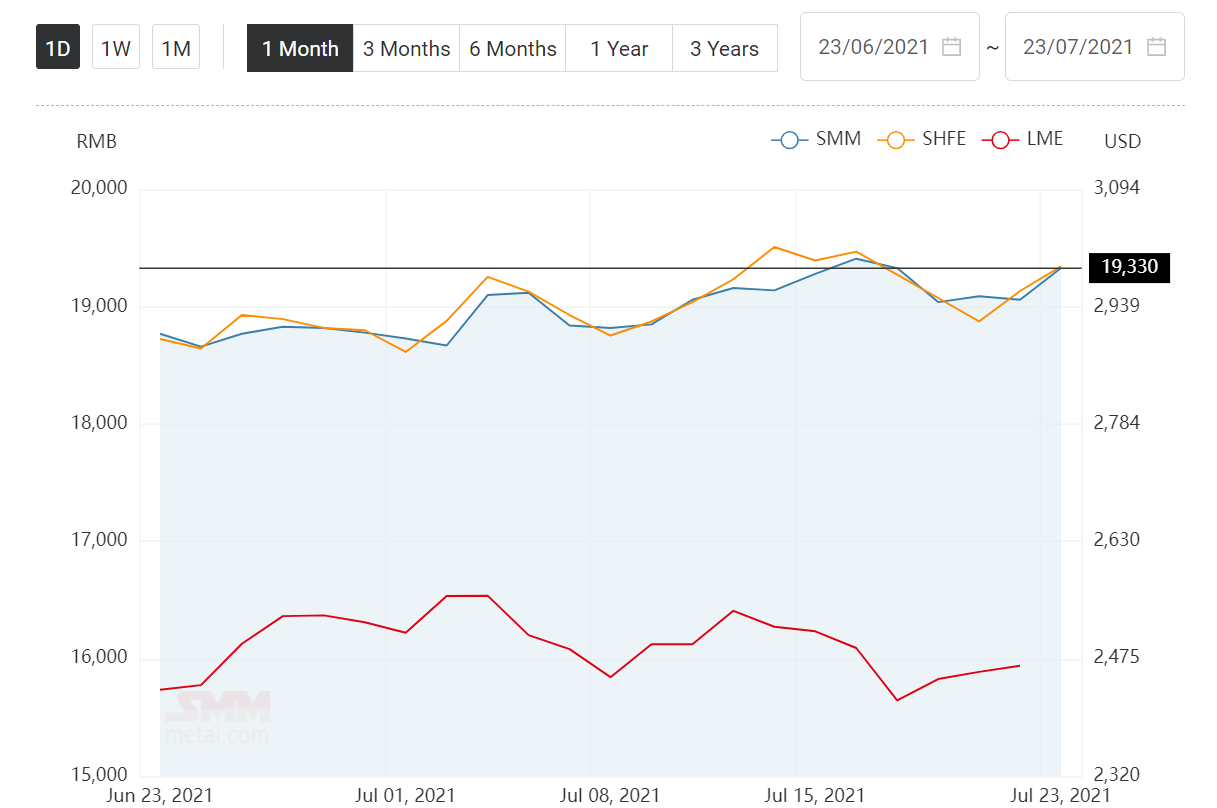 SMM aluminium ingot price increased by RMB 270 per tonne from Thursday. The price stood at RMB 19330 per tonne on Friday, July 23, 2021, from RMB 19060 per tonne. The price is expected to move within a range of RMB 19310-19350 per tonne today.