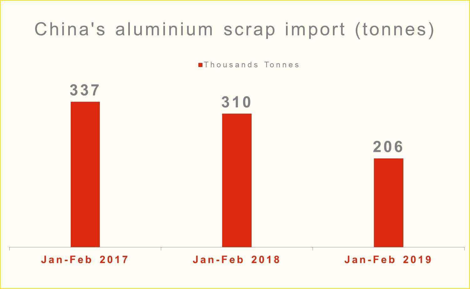 According to Shanghai Metals Market, China in the first two months of 2019 imported 206,000 tonnes of aluminium scrap in total, compared with 309,500 tonnes of import in the same period last year. Therefore, the country’s aluminium scrap import through January and February stood down 33.41 per cent or 103,500 tonnes year on year.