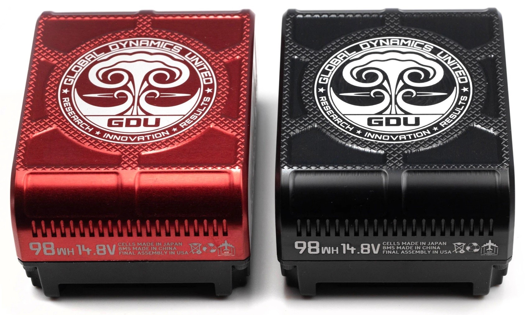 GDU Mini V-Lock batteries are new 98Wh batteries with machined 6061 aluminium back. They offer one D-Tap port and one USB 5V/2A port. Power output is 14.8V / 10A (120W), a maximum of 15A. They are available now in the black or red anodized finish.