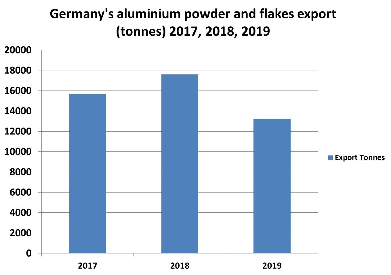 {alcircleadd}According to the global export-import data, Germany’s estimated import volume in 2018 was at 17,586 tonnes, compared to 15,675 tonnes in 2017. This means the country’s estimated import volume had registered a growth of 12 per cent year-on-year in 2018. But in contrast, Germany in 2019 is expected to import around 13,251 tonnes of aluminium powder and flakes, 15 per cent down from 2017 and 25 per cent down from 2018.
