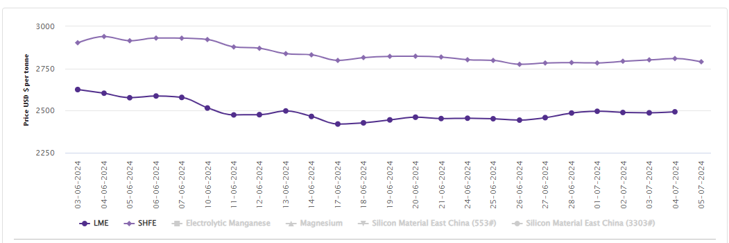 On Thursday, July 5, the SHFE aluminium benchmark price dropped by US$19 per tonne or 0.67 per cent to dock at US$2,790 per tonne. Overnight, the most-traded SHFE 2408 aluminium contract opened at RMB 20,405 per tonne, reaching a high of RMB 20,520 per tonne and a low of RMB 20,340 per tonne, and closed at RMB 20,395 per tonne, down RMB 25 per tonne or 0.12 per cent from the previous close.