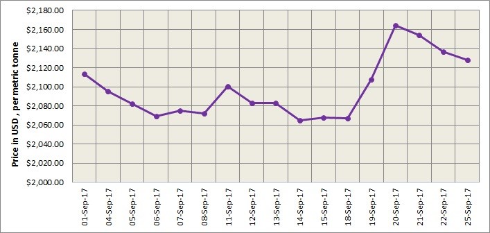 The uptrend in LME aluminium seems to be losing its momentum. The light metal contract which closed at US$2,137 per tonne last Friday, September 22, came down to close at US$2,128 per tonne on Monday, September 25. Technical analysis suggests that LME aluminium may test a support at US$2,125 per tonne, and will move in a narrow range of US$2,145-2,175 per tonne in the short term. A break below the support may lead to a loss at around US$2,108 per tonne.