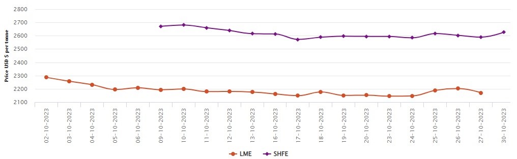 Today, on October 30, the Shanghai Futures Exchange (SHFE) aluminium price has grown by US$38 per tonne or 1.46 per cent to reach US$2,627 per tonne.