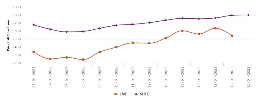 On January 19, Thursday, the LME aluminium cash bid price plummeted by US$96 per tonne or 3.64 per cent, and the LME aluminium official settlement price stooped down by US$95 per tonne or 3.6 per cent, closing at US$2,539 per tonne and US$2,541 per tonne. The market will be under immense fluctuations as the Russia-Ukraine war has been going on for almost a year now, and Europe's oil/energy crisis is on the verge of evoking a nationwide recession.