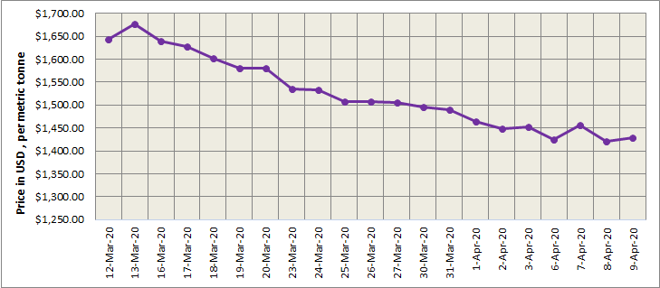 Benchmark aluminium price for SHFE stood at US$1672 per tonne on Monday, 13 April 2020.