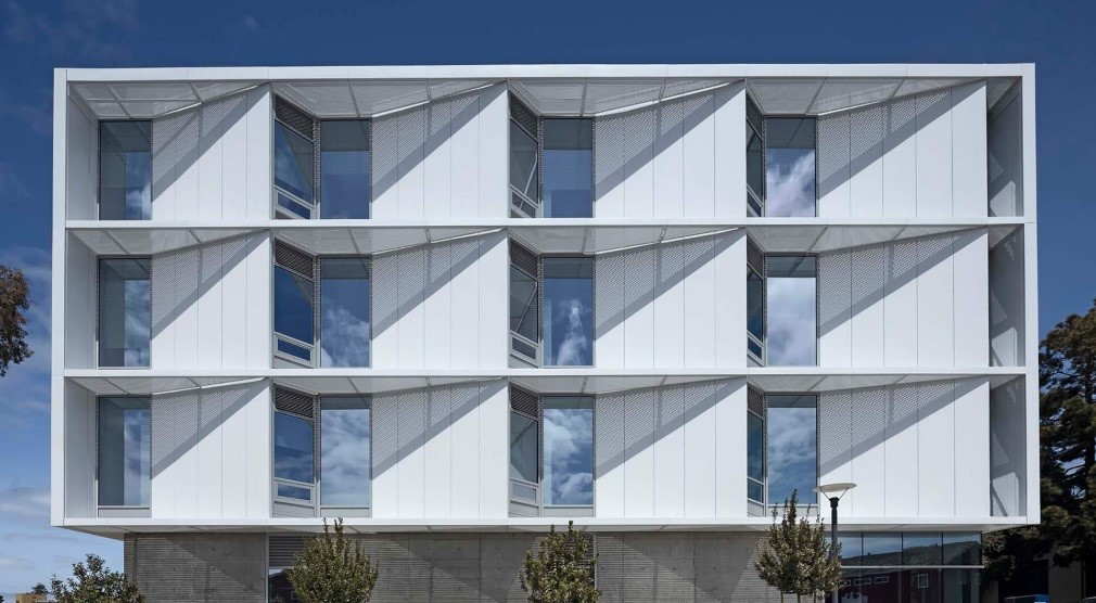 Cavagnero chose aluminium insulated panels and a horizontal aluminium sunshade for the project due to their noncorrosive properties despite considering San Francisco's generally mild weather and temperature conditions. The site's proximity to the Pacific Ocean, the resulting marine airflow, and the city's famous fog were also considered.