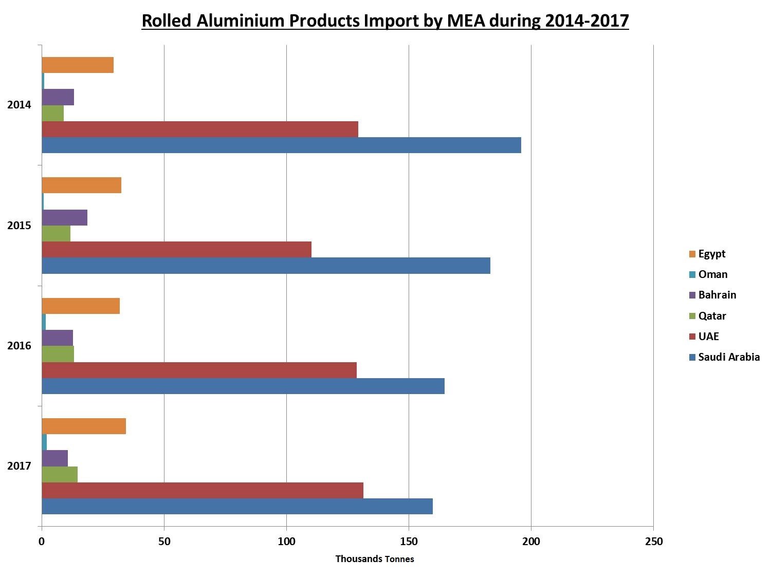 According to global trade data, major countries in the MEA namely Saudi Arabia, UAE, Qatar, Bahrain, Oman, and Egypt in a combined manner imported 377476 tonnes of aluminium plates, sheets and strips in 2014. Since then, the import volume has declined year-on-year. In 2016, they imported 352560 tonnes of aluminium plates, sheets and strips.