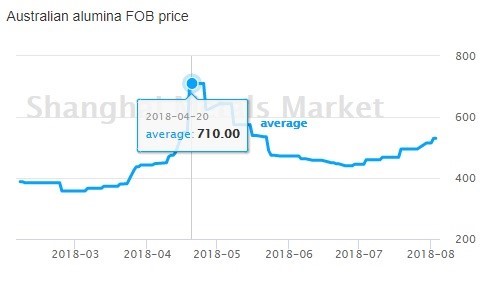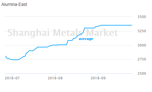 Domestic alumina spot prices in China are cheaper than alumina from Australia, which is driving Chinese companies to export alumina. Though China exports very less of alumina, the country’s alumina export has seen a solid growth since April. Australian FOB price stood at $626 per tonne in the second week of September, just shy of the record $643 seen at the start of May and has recently come down to US$ 535 per tonne after the extension of Rusal sanction. According to Shanghai Metals Market, China average spot alumina prices dropped to RMB 3284 (US$478) per tonne now, from RMB 3302 (US$ 482) per tonne in September begining, the highest since December 2017. In East China market, the prices now stand at RMB 3350 (US$488) per tonne, still much higher. The lowest level the alumina prices have touched in 2018 was about US$ 370 per tonne and the level is not expected unless all current supply disruptions come into place.