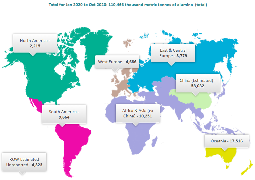 Global alumina output during January-October 2020 stood at 110.466 million tonnes, slightly up by 0.55 per cent from 109.866 million tonnes during the same period last year. Metallurgical-grade alumina production came in at 104.068 million tonnes. Except in China, where alumina production dwindled during the above mentioned period by 2.78 per cent year-on-year to 58.032 million tonnes, the output increased in Africa & Asia (ex-China), East & Central Europe, and also in South America. In Africa & Asia (ex-China), alumina production stood at 10.251 million tonnes, 19.63 per cent more than 8.569 million tonnes during the corresponding period last year. East & Central Europe produced 3.779 million tonnes, up by 2.91 per cent from 3.672 million tonnes last year; while South America churned out 9.664 million tonnes, 10.62 per cent higher than 8.736 million tonnes. In the Oceania region, the second-highest alumina producer after China, produced 17.516 million tonnes during January-October 2020, compared to 16.970 million tonnes a year ago.