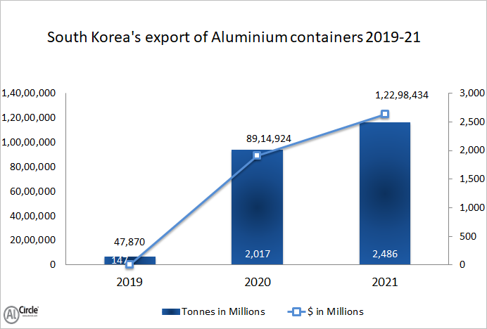 The East Asian nation, South Korea exported 2164 tonnes of aluminium containers during 2019-20, which are very much used in the food and hospitality industry and the revenue incurred from the export of containers accounted for $8.96 million.