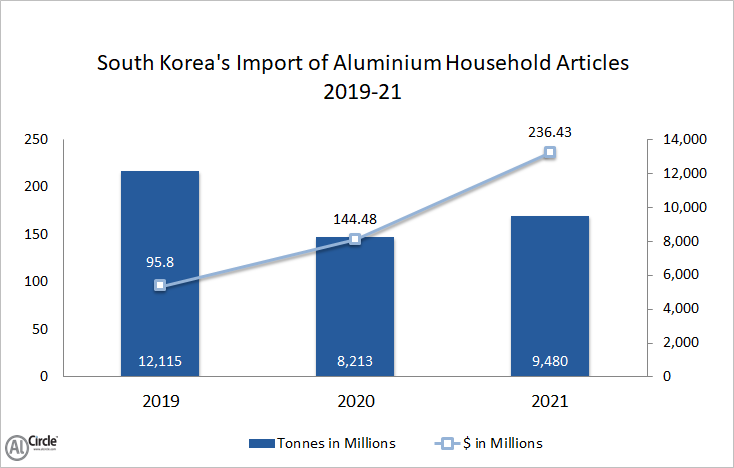 South Korea’s import of aluminium household articles in 2019 was recorded at 12,115 tonnes and the expenditure inherited for the import was $95.80 million, whereas, in 2020 revealed a sharp downfall by 32.20%, as the import volume plunged to 8213 tonnes, while the expenditure soared to $144.48 million.