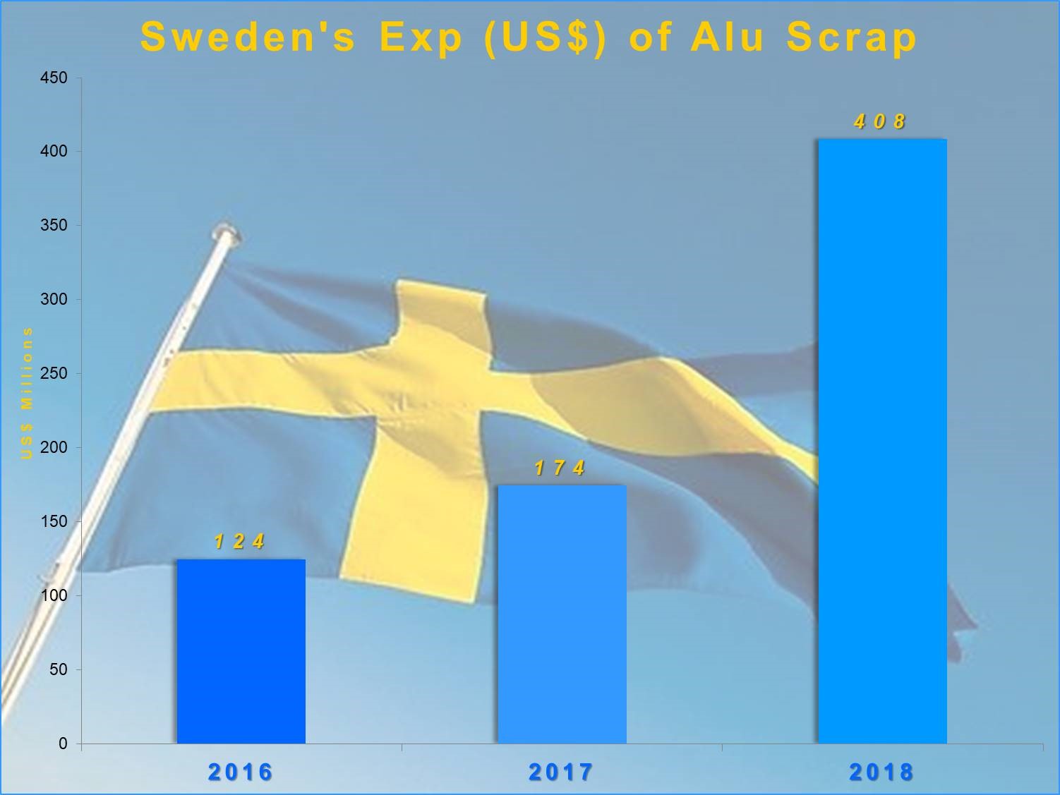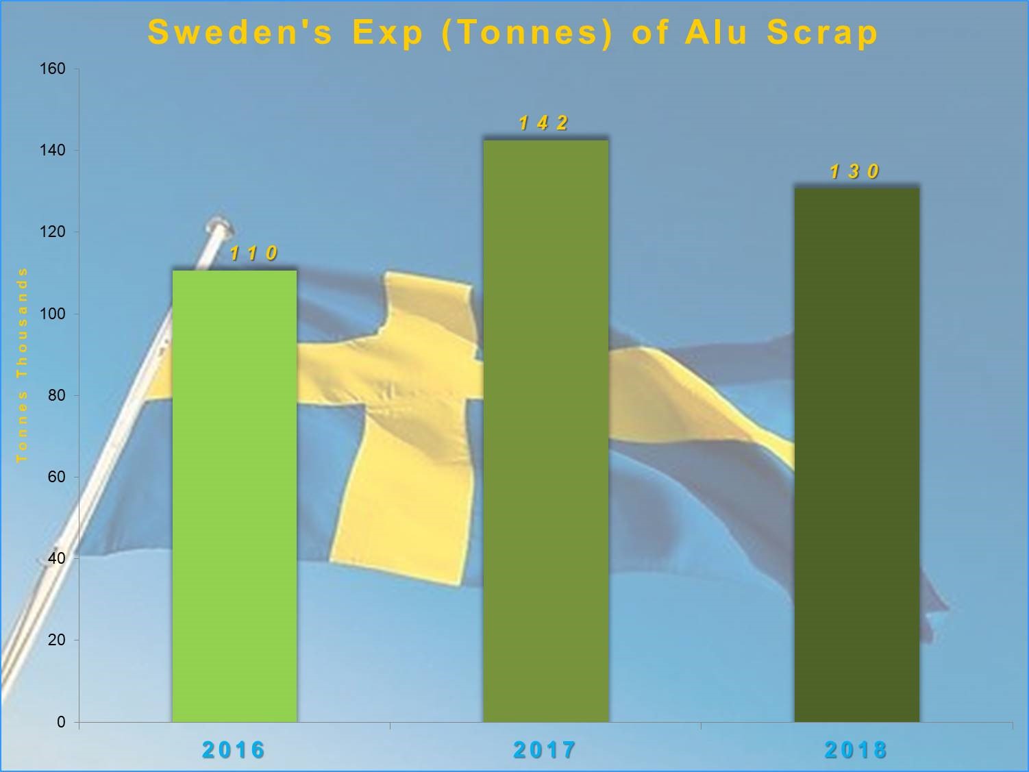 Data shows the total aluminium scrap export by Sweden stood at about 110 thousand tonnes in 2016. The amount increased about 29 per cent year-on-year to about 142 thousand tonnes in 2017. For the full year 2018, the total aluminium scrap export by the country is estimated to stand at about 130 thousand tonnes, a decrease of 8 per cent year on year.