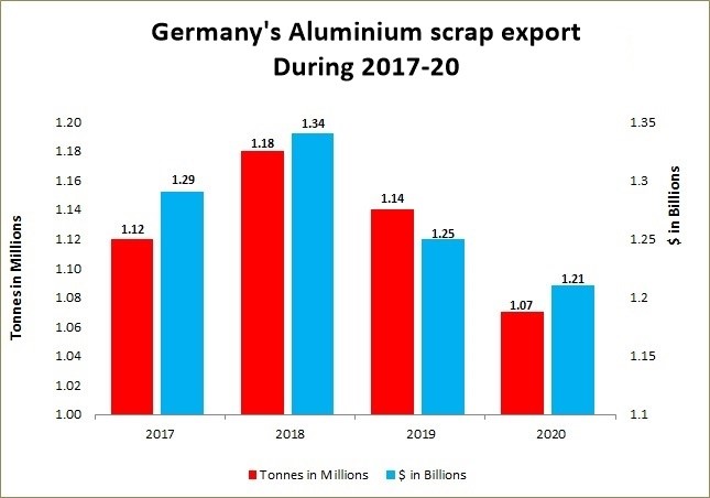 The aluminium scrap export of Germany in 2017 has been recorded by 1.12 million tonnes, while the income has remained to $1.29 billion. In 2018 a growth of 5.35% has been recorded, as the total export volume reflected at 1.18 million tonnes and the revenue generation reached to $1.34 billion.