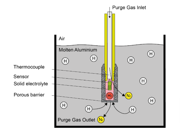 To enable this electrochemical system to function in liquid aluminium, the sensor is enclosed in a chamber within the end of the metal and ceramic probe. It is separated from the aluminium by a porous diffusion barrier. When the probe is placed in the aluminium, the hydrogen dissolved in the melt diffuses through the porous membrane and forms hydrogen gas within the chamber in which the sensor sits. The voltage generated by the cell is then measured and taken to an analyser using a flexible cable. By taking into account several variables, such as melt temperature and alloy composition, the level of dissolved hydrogen in the melt can then be quickly and accurately determined. Once calculated, the analyser continuously displays and records the hydrogen value and melt temperature.