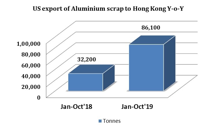 The aluminium scrap export of the US to Hong Kong during January18-October’18 remained at 32,200 tonnes. In 2019 the scrap export rose to 86,100 tonnes, as of Y-o-Y basis growth of 167.39% was noticed, the excess volume of 53,900 tonnes.