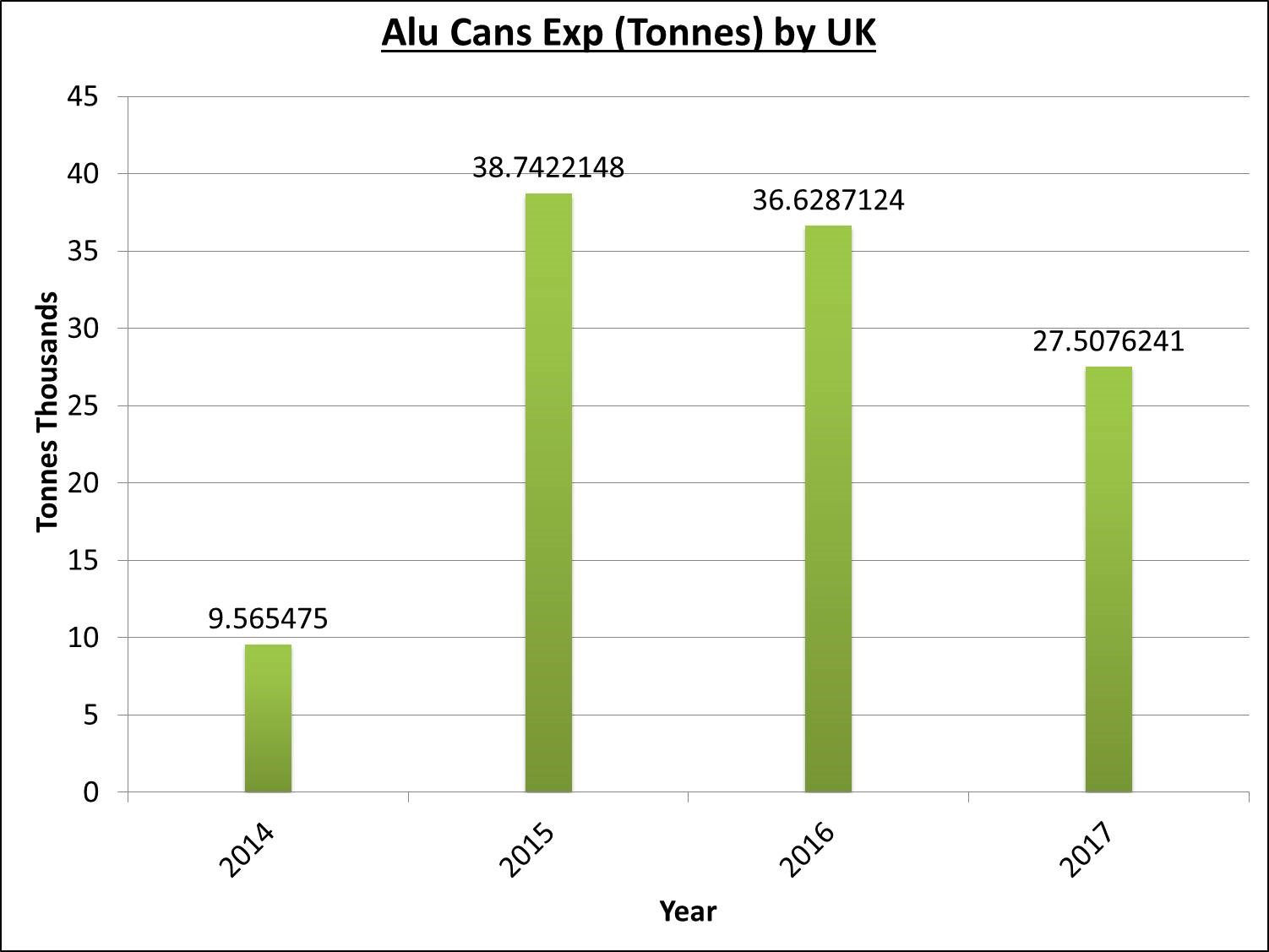 It is estimated that UK will export 27508 tonnes of aluminium cans in 2017, a decrease in volume by 29 per cent since 2015.