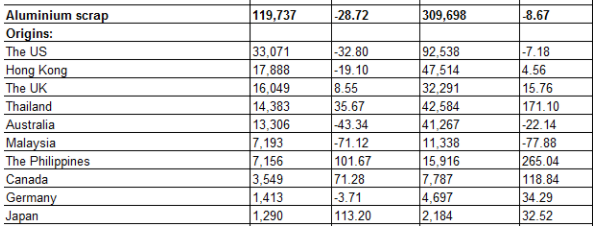 According to statistics by Institute of Scrap Recycling Industries (ISRI), China’s scrap came from several nations, but considering the U.S. has been the world’s leading aluminium scrap exporter each year since at least 2005, a large percentage of China’s imports each year come from the U.S.