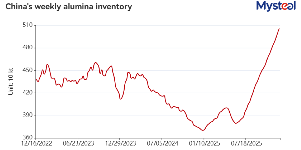 As of December 11, total alumina stocks across the country’s 10 major ports, 44 alumina producers, 89 primary aluminium smelters, and rail yards or in transit under Mysteel’s regular tracking had reached 5.06 million tonnes, according to results of Mysteel’s latest survey. This represented another 1.1 per cent increase from the previous week and renewed the highest level since Mysteel began the survey in January 2022.