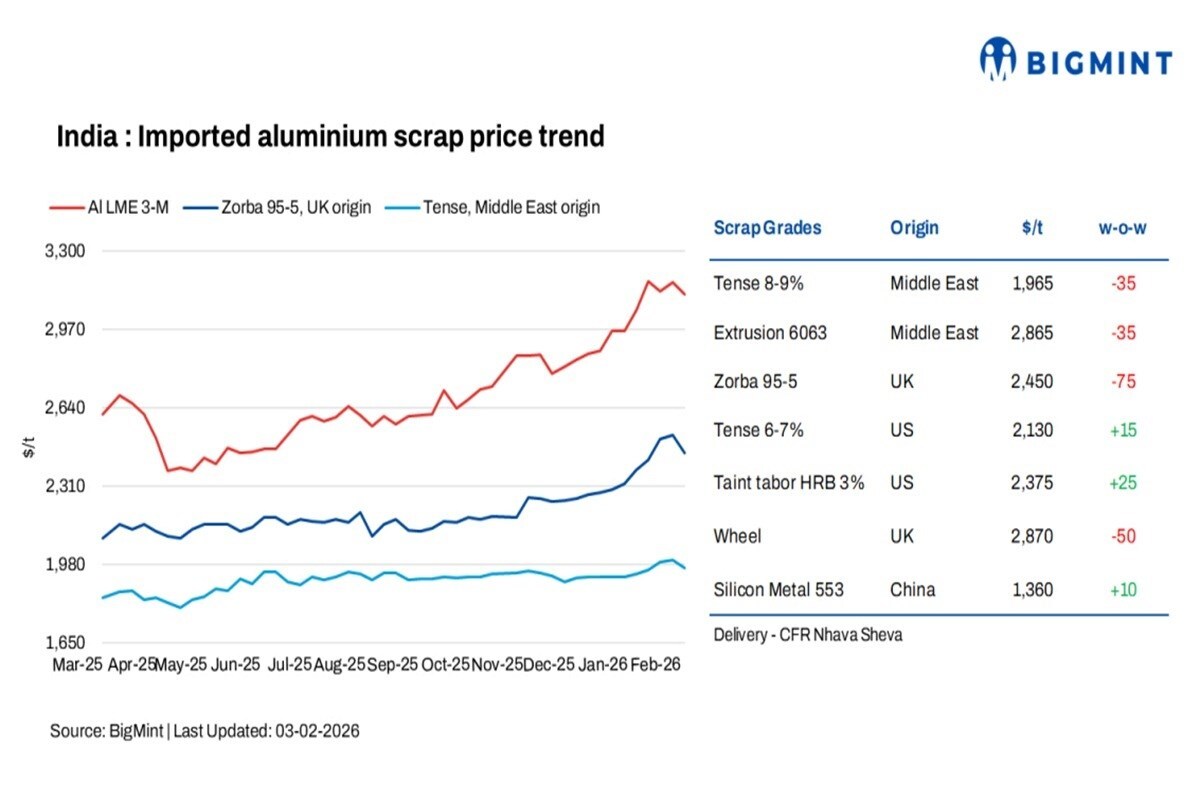 BigMint assessed Middle East-origin Tense (8-9 per cent) at USD1,965 per tonne, down USD35 per tonne w-o-w, whereas Extrusion 6063 edged down by USD35 per tonne to USD2,865 per tonne, though demand for these grades remained firm.