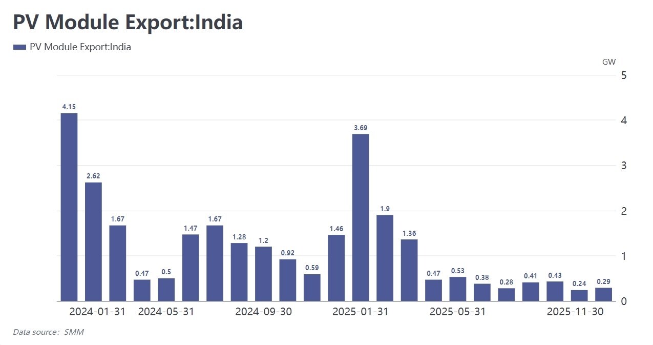 Exports of solar cells experienced explosive growth. In H1 2025, China's solar cell exports surged, with India absorbing approximately 50 per cent of the total. According to SMM data, from January to November 2025, China's solar cell exports to India increased to over 49 GW from 33 GW in the same period last year, up 47.17 per cent Y-o-Y.
