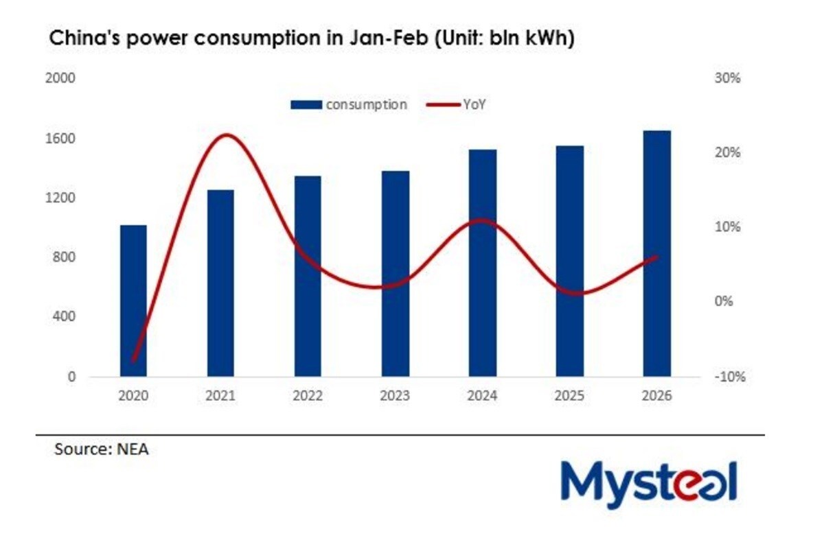 The figure represents a record high for the January-February period, with the 6.1 per cent on-year rise also exceeding the upper end of the 5-6 per cent annual growth range that the China Electricity Council had forecast earlier this year, Mysteel Global observes.