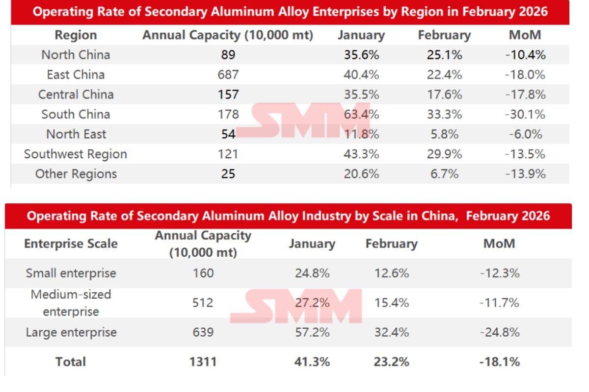 {alcircleadd}According to the SMM survey, the operating rate of secondary aluminium producers in February 2026 fell by 18.1 percentage points M-o-M from January to 23.2 per cent, down 9.4 percentage points Y-o-Y. In February, operating rates of enterprises across all regions declined sharply.
