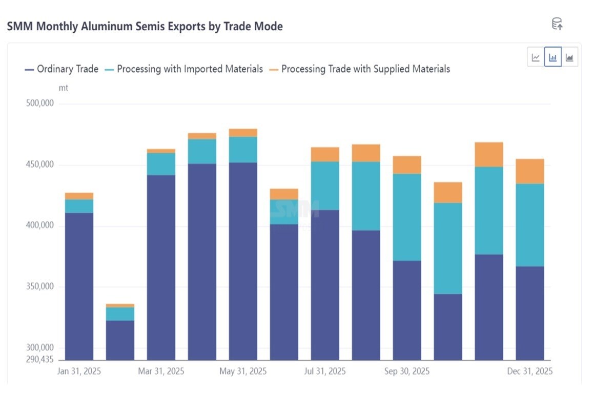 On December 1, 2024, the "Announcement on Adjusting Export Tax Rebate Policies" officially took effect, marking the end of the 13 per cent export tax rebate for aluminium semis and copper semis products. This policy adjustment not only directly impacted the traditional export model dominated by Ordinary Trade but also quietly reshaped the trade pattern of China's aluminium semis exports. In 2025, total aluminium semis exports reached 5.5 million tonnes, a decrease of 750,000 tonnes y-o-y, representing a decline of 12 per cent. However, beneath this overall contraction, the transformation of trade modes is accelerating—Processing Trade, particularly Processing Trade with Imported Materials, is moving from the periphery to the centre stage, becoming a key pathway for enterprises to cope with policy changes and maintain export competitiveness.
